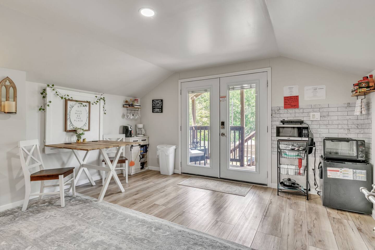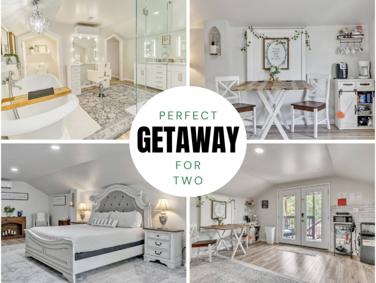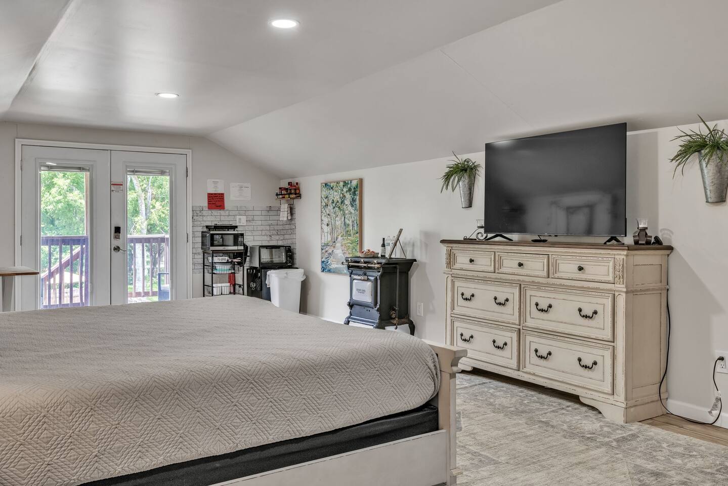 This dreamy, private studio is the perfect hideout for two. Inside, you'll find a plush king bed set beneath soft ambient lighting and romantic accents throughout. A cozy dining nook with a charming table setup is perfect for morning coffee or intimate meals. The soaking tub and full bathroom create a spa-like experience, while a sleek coffee station and thoughtful decorβlike candles, textures, and curated artβadd warmth and charm. Outside, step onto your private deck with a hot tub, seating area, and fire pit under the stars and a charcoal grill for sizzling BBQ. Whether you're celebrating something special or just escaping the everyday, this space is designed for connection, comfort, and calm.